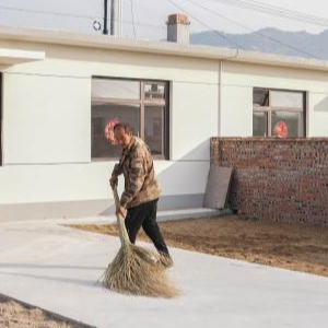 11月8日,辽宁省葫芦岛市绥中县祝家沟村村民在集中安置重建住房清扫院子。