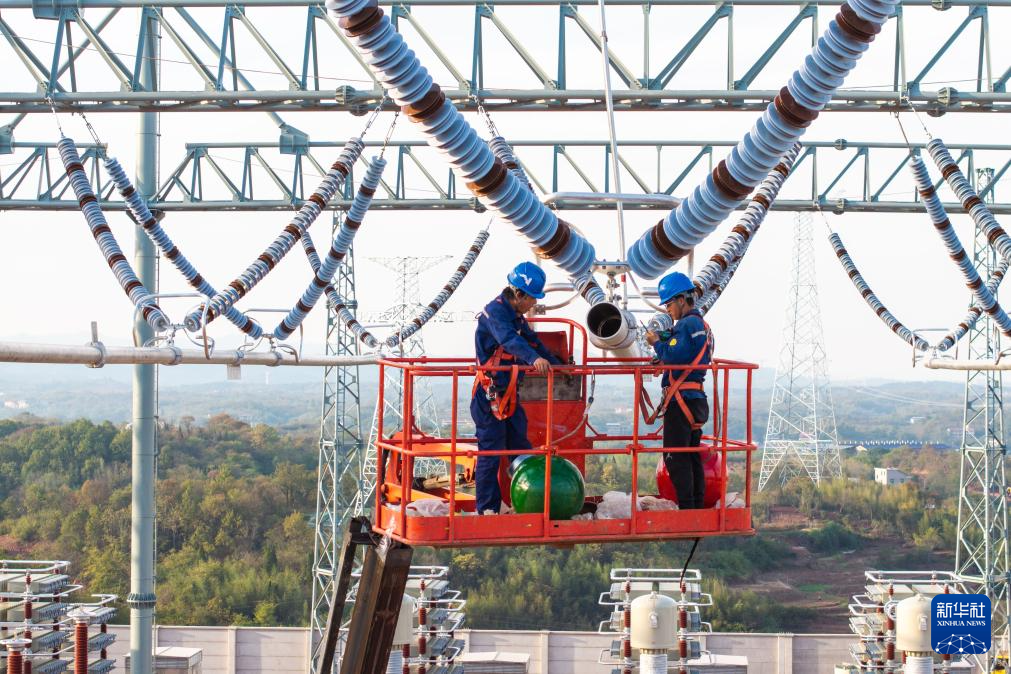 11月8日,在位于衡南县泉湖镇的衡阳换流站,电力工人在安装绝缘球(无人机照片)。