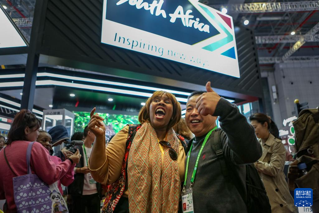 11月8日,参展商和参观者在第七届进博会国家展南非馆合影。