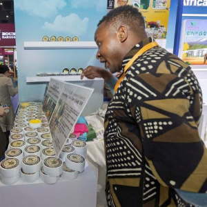 11月8日,参展商在第七届进博会食品及农产品展区的非洲产品专区介绍。