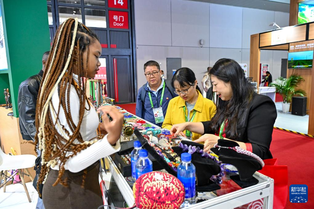 11月7日,人们在第七届进博会国家展多哥馆查看饰品。