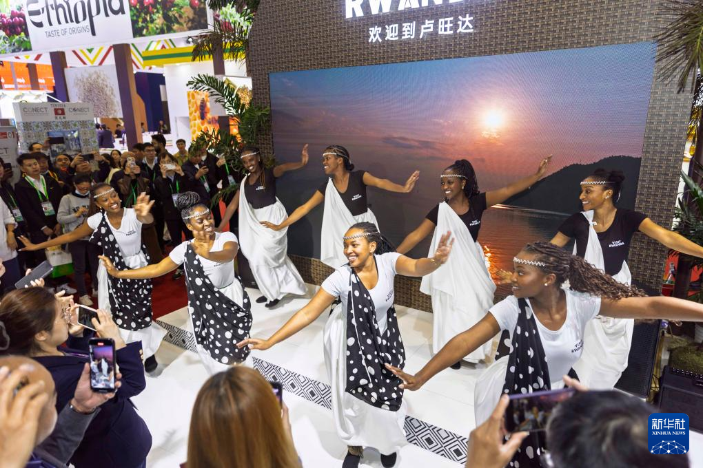 11月7日,演员在第七届进博会国家展卢旺达馆表演舞蹈。