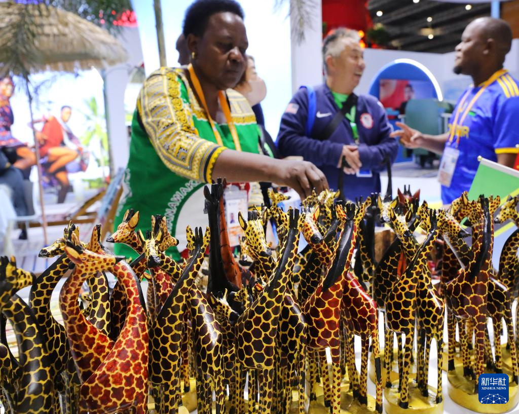 这是11月7日在第七届进博会国家展坦桑尼亚馆拍摄的木雕艺术品。