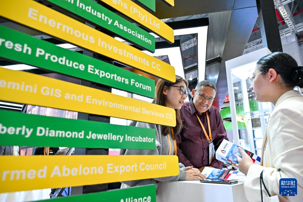11月7日,参观者在第七届进博会国家展南非馆与参展商交谈。