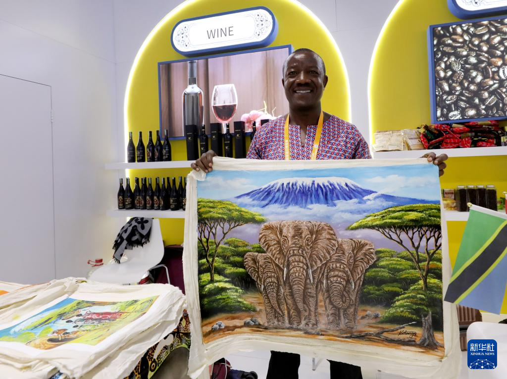 11月7日,一名参展商在第七届进博会国家展坦桑尼亚馆展示绘画作品。