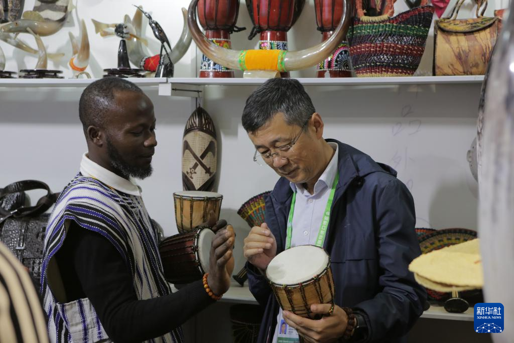 11月8日,一名参观者在第七届进博会消费品展区的加纳商品展台体验手鼓。