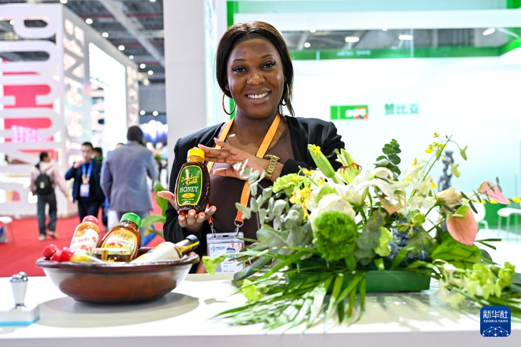 11月7日,一名参展商在第七届进博会国家展赞比亚馆展示一款蜂蜜产品。