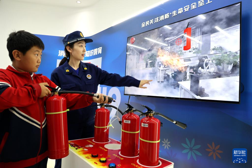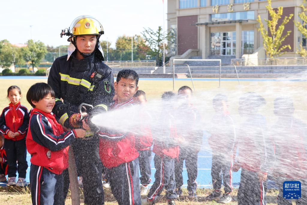 11月8日,在山东省滨州市阳信县劳店镇科普教育大厅,小朋友在消防救援队员的指导下进行模拟灭火训练。