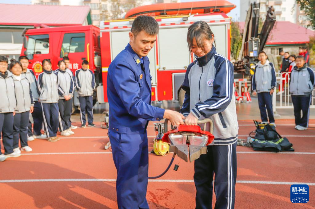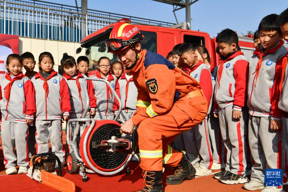 11月7日,在山东省枣庄市台儿庄区兰祺实验小学,消防救援队员向学生们介绍消防器材功能。