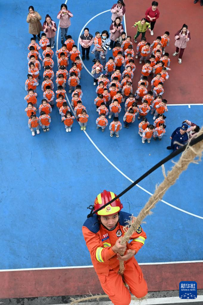 11月5日,在四川省内江市东兴区消防救援大队,辖区幼儿园小朋友在观摩消防救援技能展示。