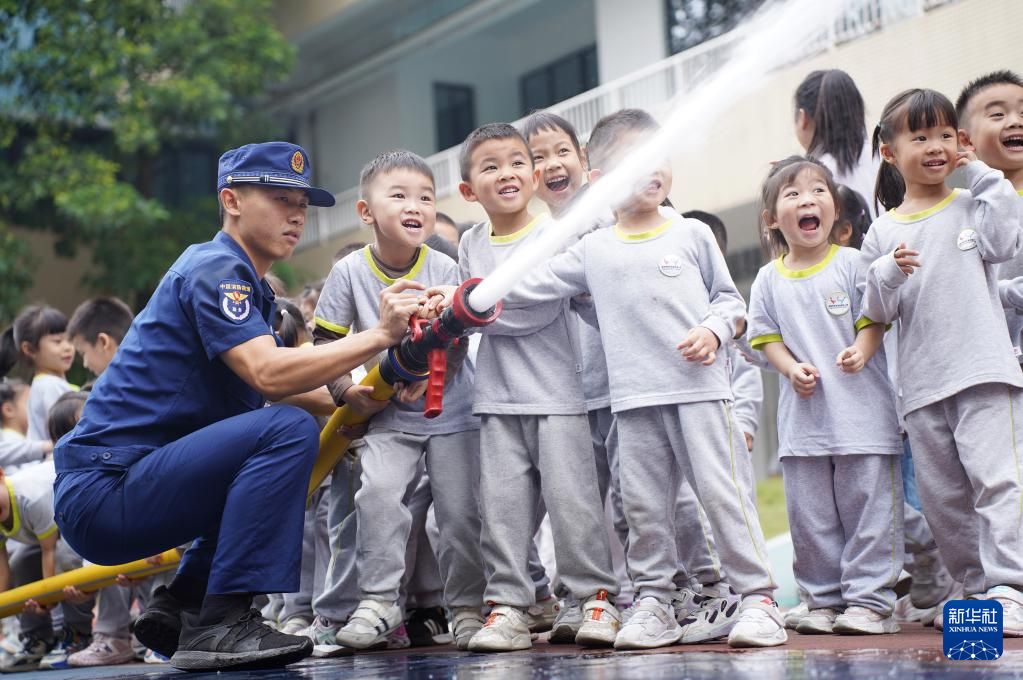 11月5日,在福建省龙岩市新罗区西陂街道一家幼儿园,小朋友在消防员的指导下体验消防水枪射水。