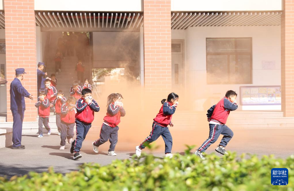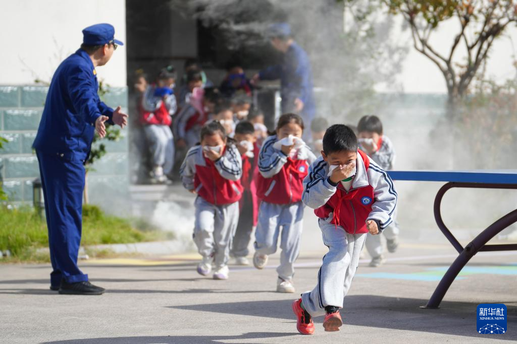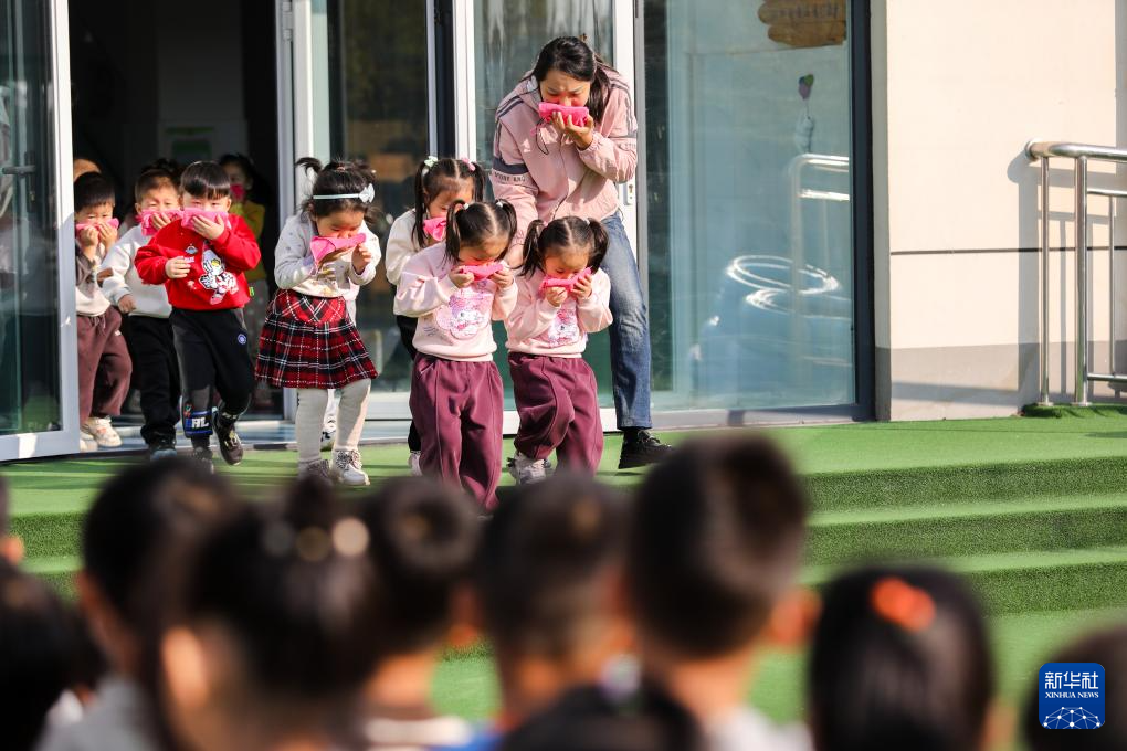11月8日,在山东省淄博市高青县中心路幼儿园,老师带领孩子们进行消防应急逃生演练。