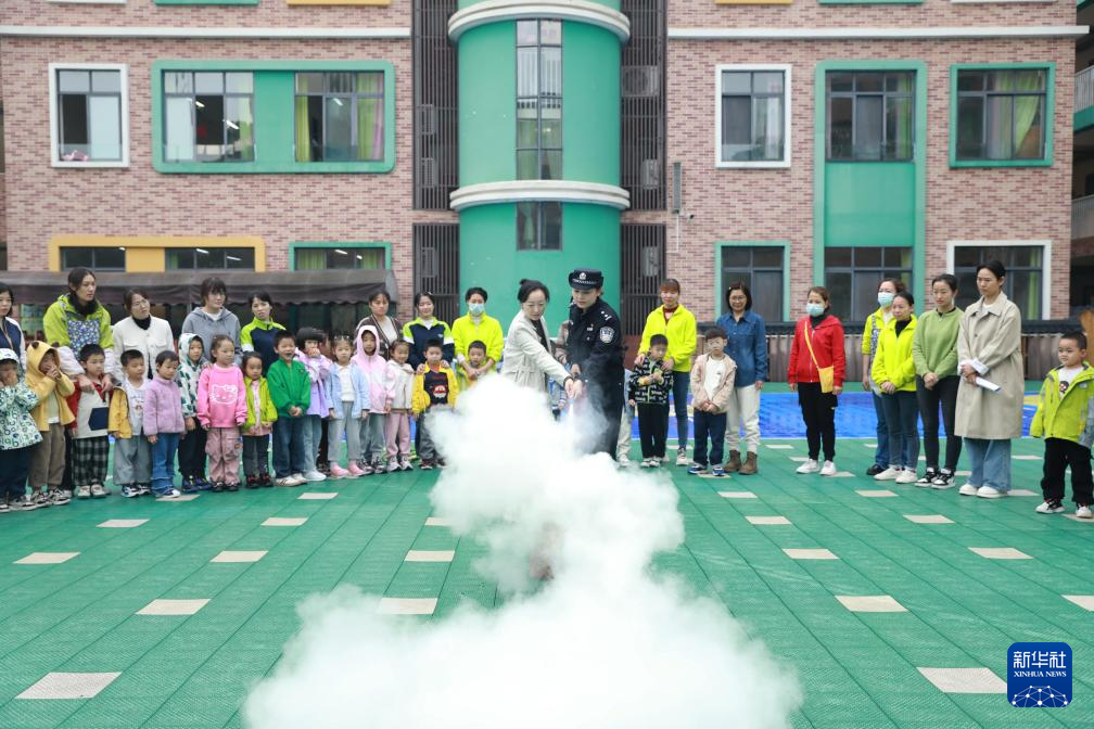 11月8日,贵州省赤水市公安局民警在实验幼儿园指导老师正确使用灭火器。
