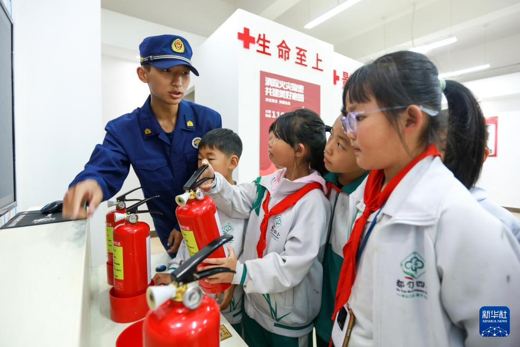 11月8日,在贵州省都匀市第四小学消防体验馆,消防救援人员为同学们普及消防知识。