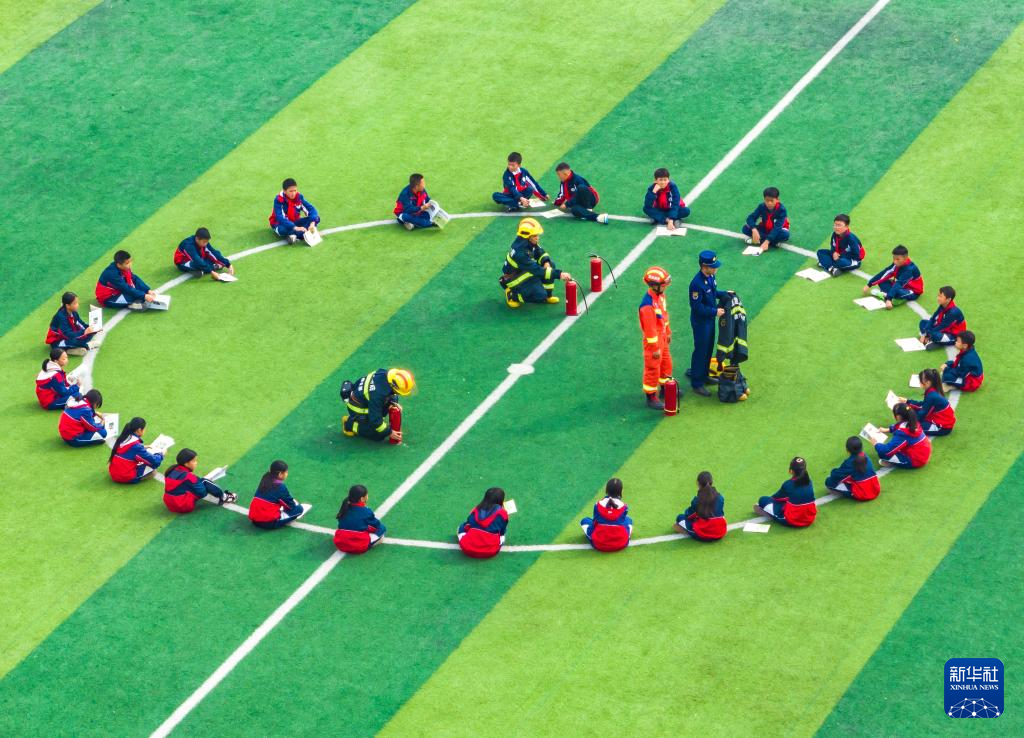 11月8日,贵州省安顺经济技术开发区消防救援大队消防员在安顺黄齐生小学为学生讲解展示消防器材(无人机照片)。