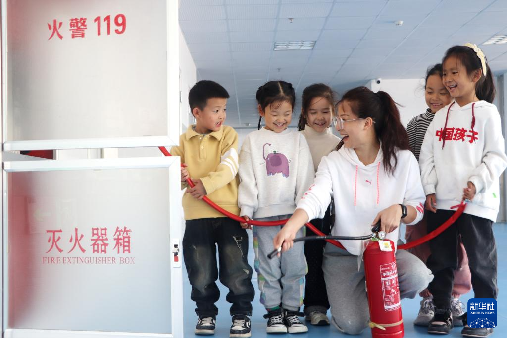 11月8日,甘肃省定西市安定区实验幼儿园的老师引导小朋友认识灭火器。