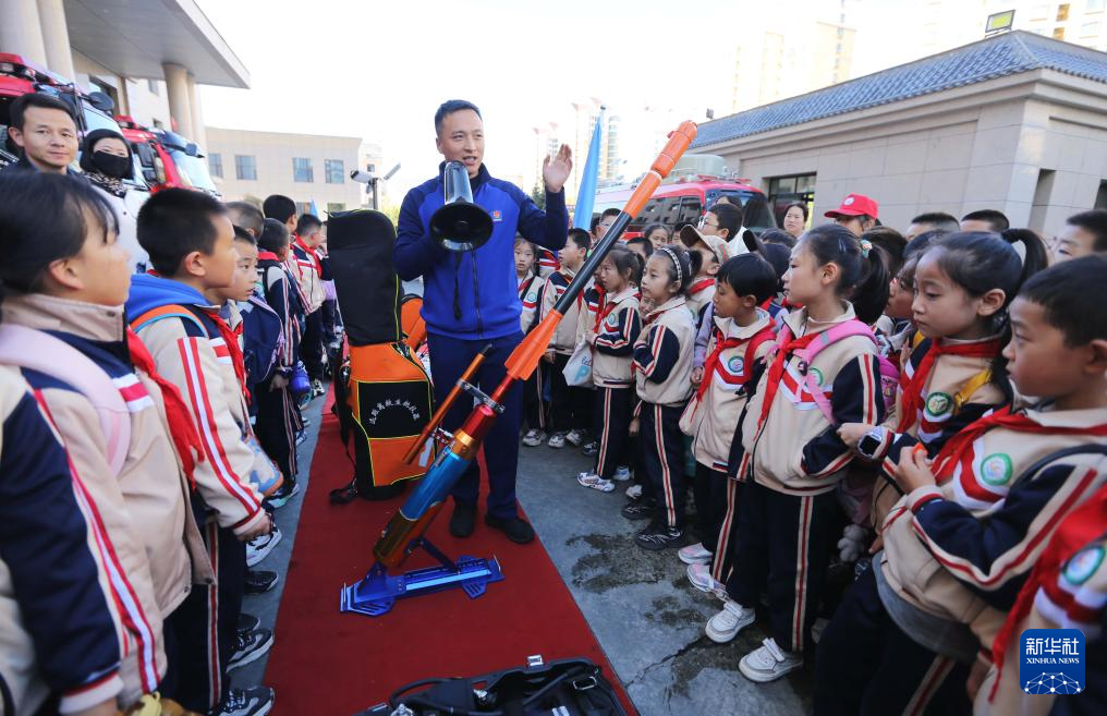 11月6日,消防员给甘肃省定西市安定区第二实验小学的学生讲解消防器材的使用。