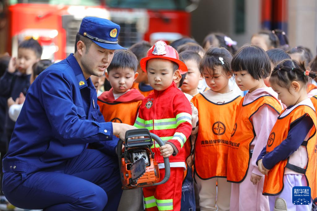 11月8日,在山东省青岛市李沧区消防救援大队李村站,小朋友体验使用消防救援器材。