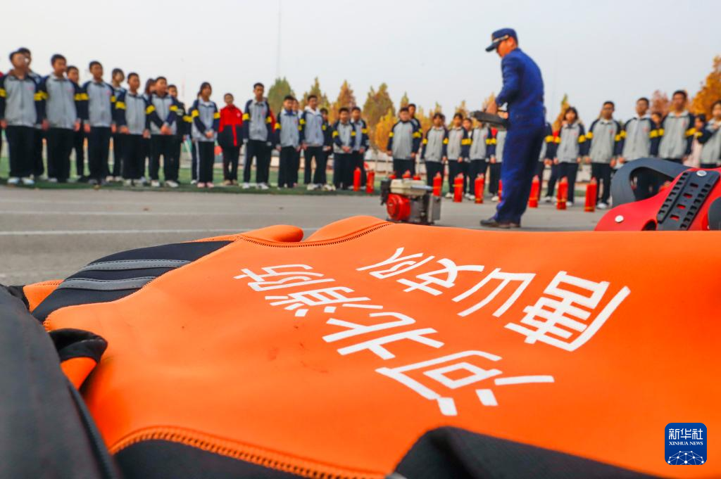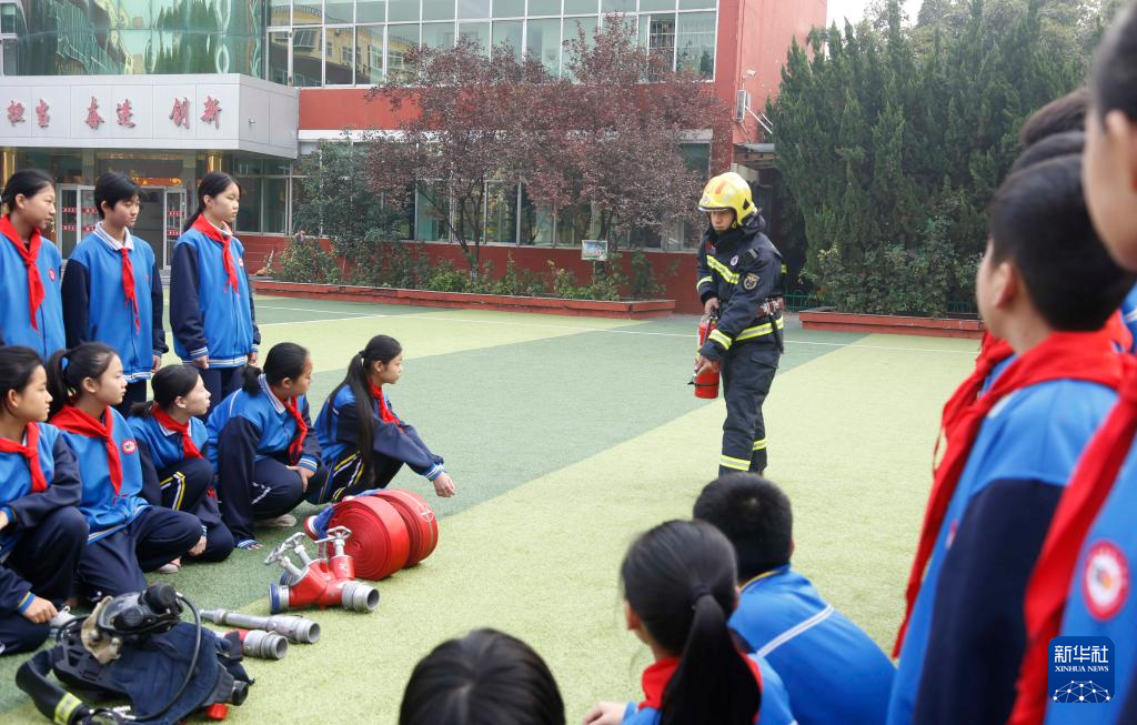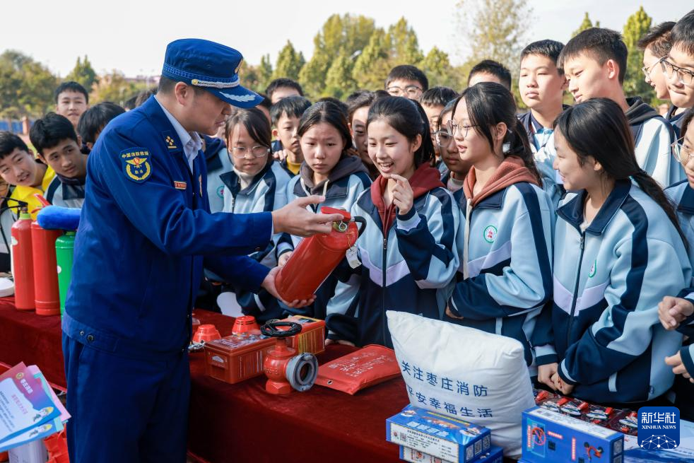 11月8日,在山东省枣庄市薛城区北临城中学,消防救援人员为学生普及消防产品知识。
