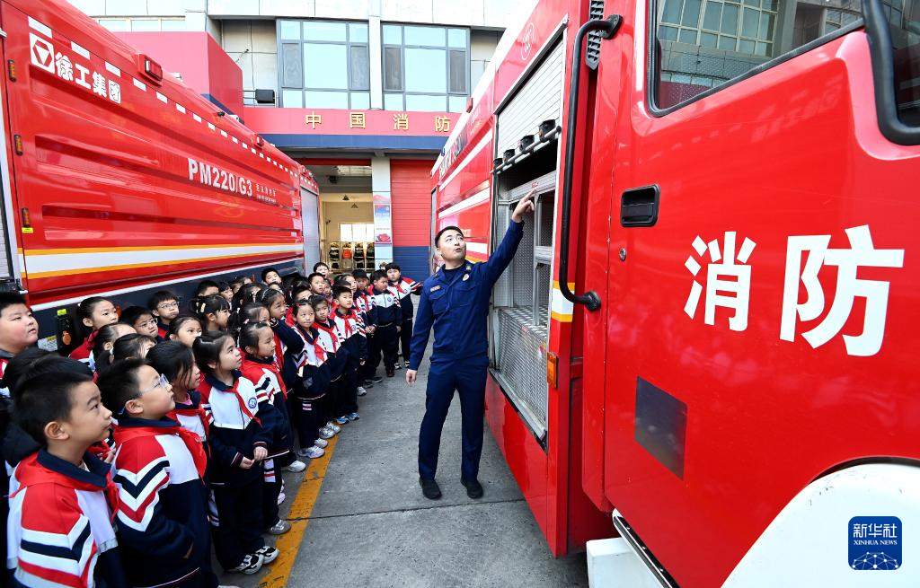 11月5日,河北省邯郸市消防救援支队特勤大队一站的消防员为邯山区赵王小学的同学讲解消防安全知识。