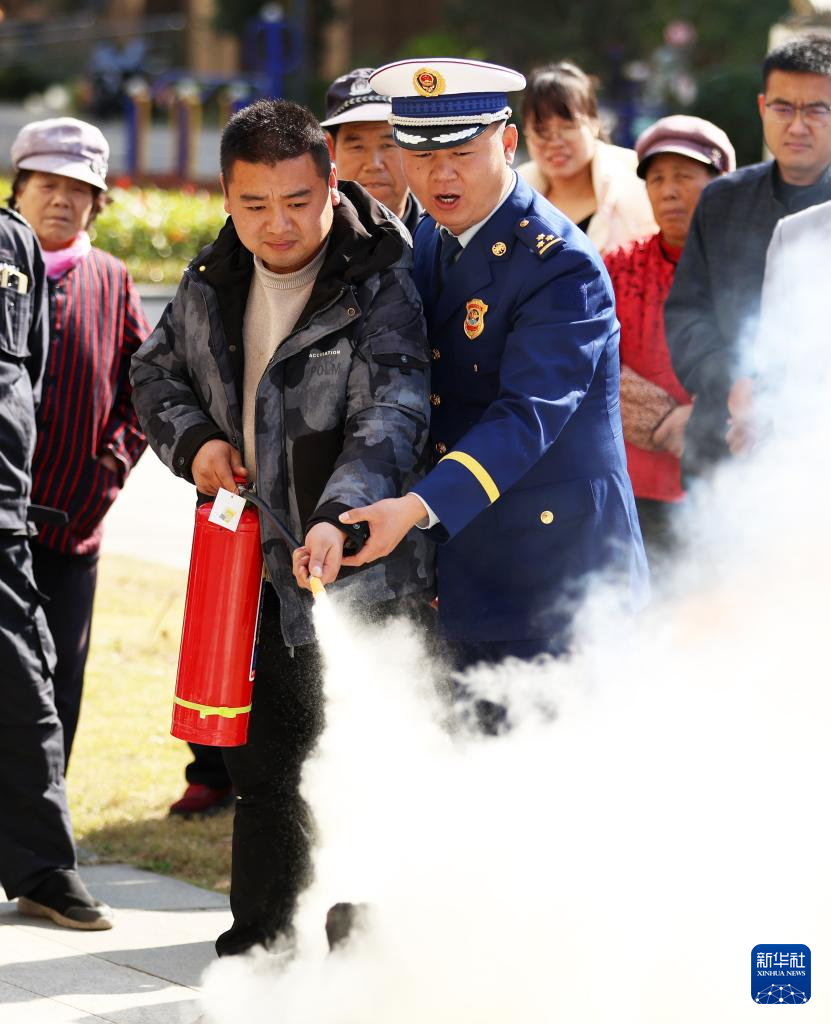 11月8日,山东省临沂市郯城县消防救援大队消防救援人员在郯城街道府东社区为居民讲解灭火器的正确使用方法。