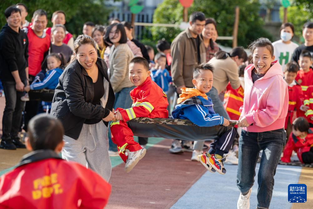 11月8日,在浙江省湖州市长兴县水口乡中心幼儿园,家长和孩子参加“火速救援”亲子消防主题趣味运动。