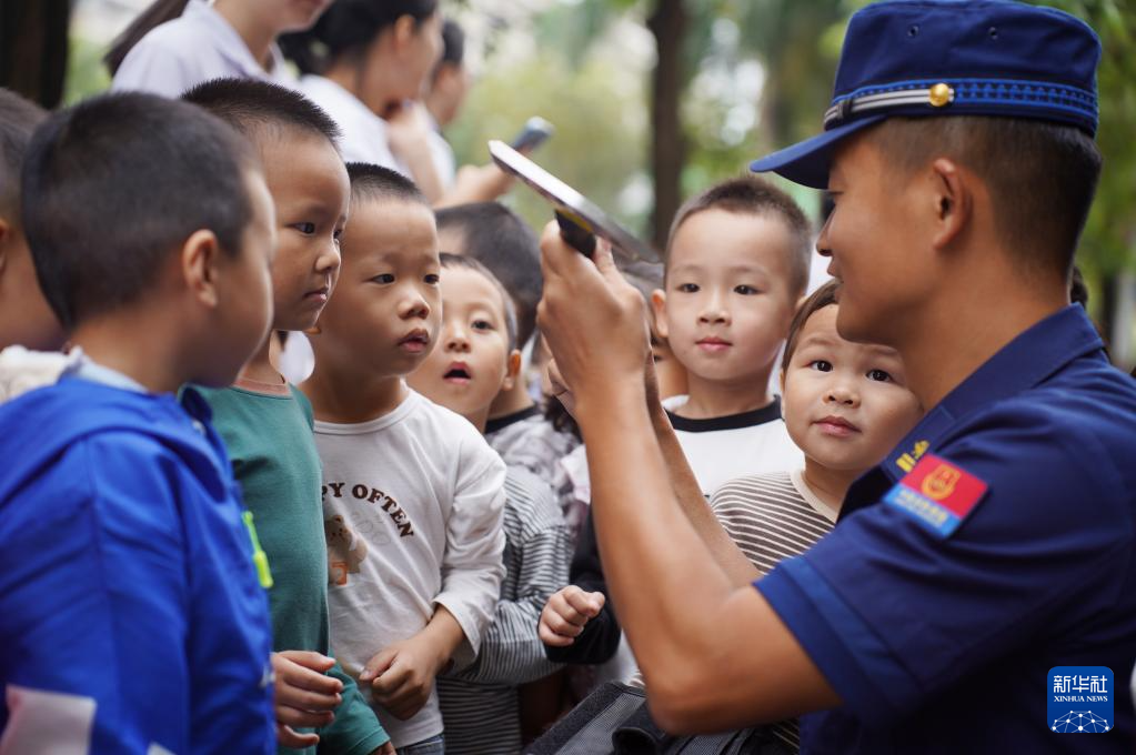 11月5日,在福建省龙岩市新罗区西陂街道一家幼儿园,消防员向小朋友讲解消防装备知识。
