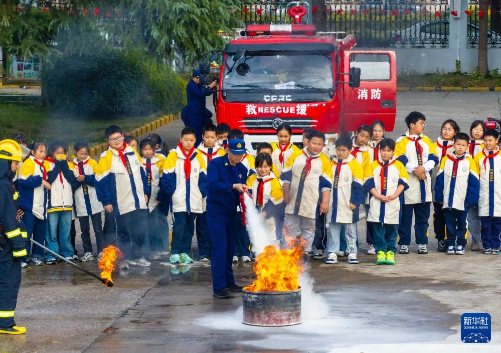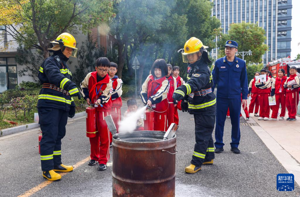 11月8日,在江苏省扬州市江都区大桥中心小学,学生在江都区消防救援大队队员指导下体验灭火。