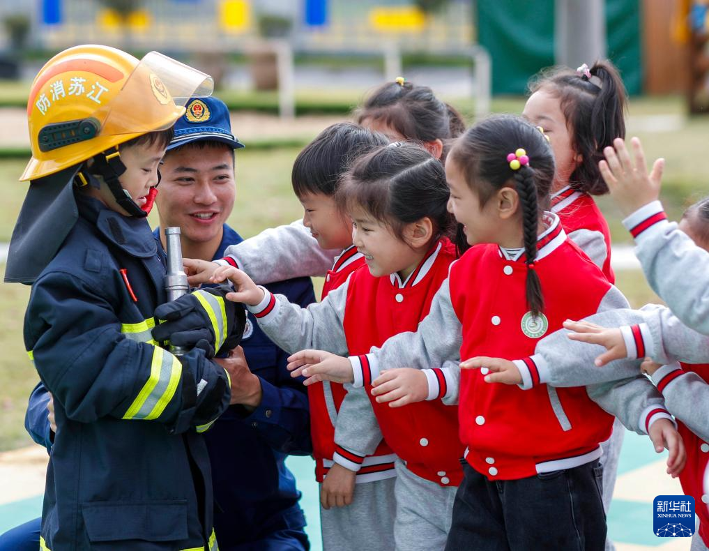 11月8日,在江苏省兴化市文峰幼儿园,小朋友在兴化市消防救援大队消防员的指导下体验穿戴消防灭火防护服。