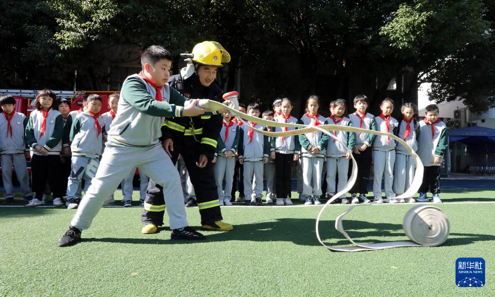 11月7日,在浙江省湖州市德清县乾元镇中心小学,消防救援人员指导学生使用消防水枪。