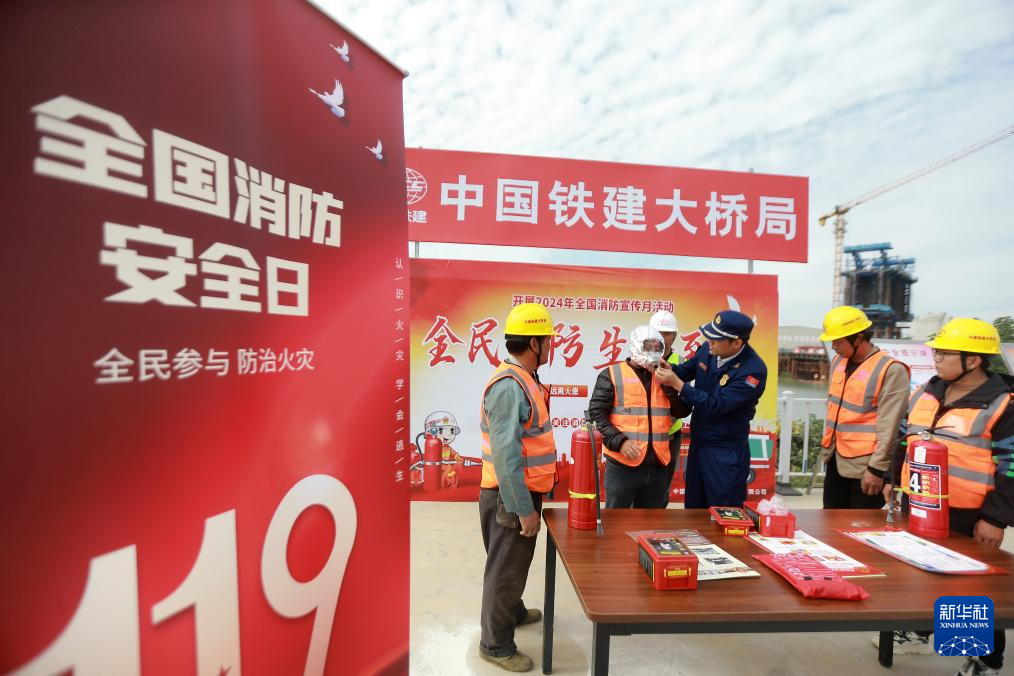 11月8日,在沪渝蓉高铁江苏扬州段的一处建设工地,江苏省扬州市消防救援支队的消防员为中国铁建大桥局的工人讲解消防安全知识。