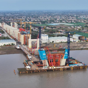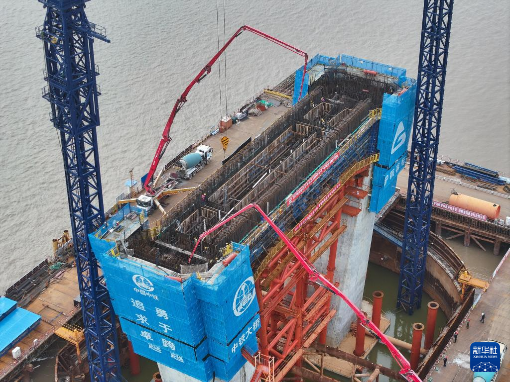 当日,由中铁大桥局承建的崇启公铁长江大桥4号主塔下横梁及其塔柱连接段首层浇筑完成,标志着大桥迈入新的施工阶段,为后续钢梁施工打下坚实基础。
