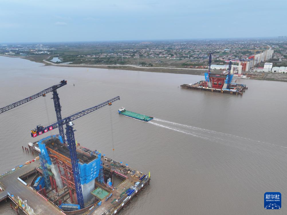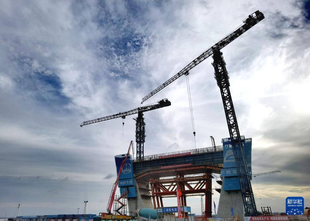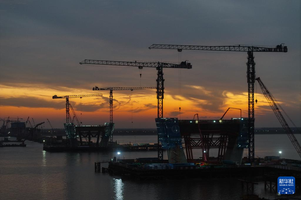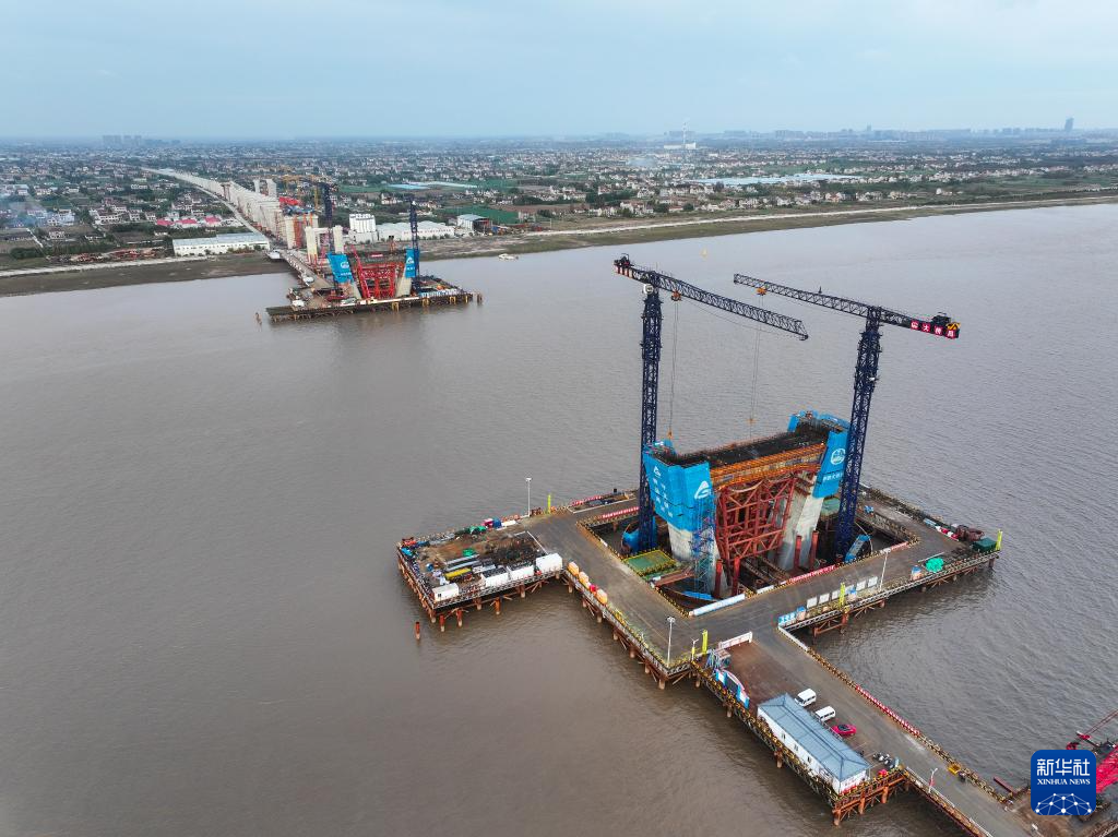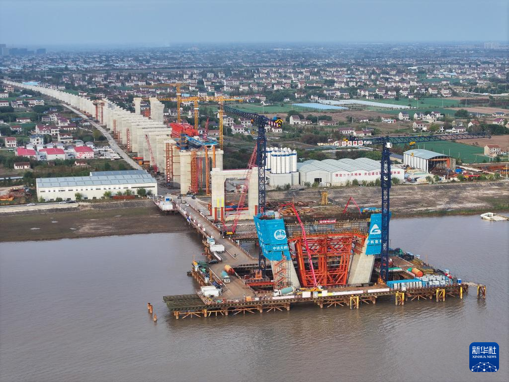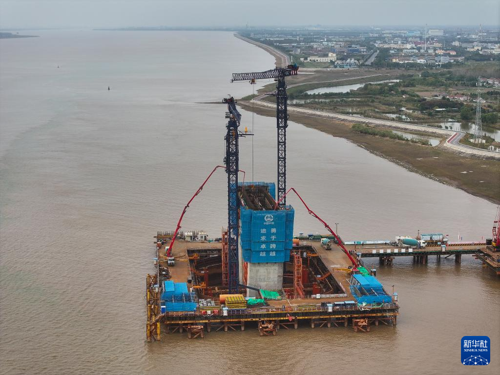 11月9日拍摄的崇启公铁长江大桥4号主塔下横梁及其塔柱连接段首层浇筑施工现场(无人机照片)。