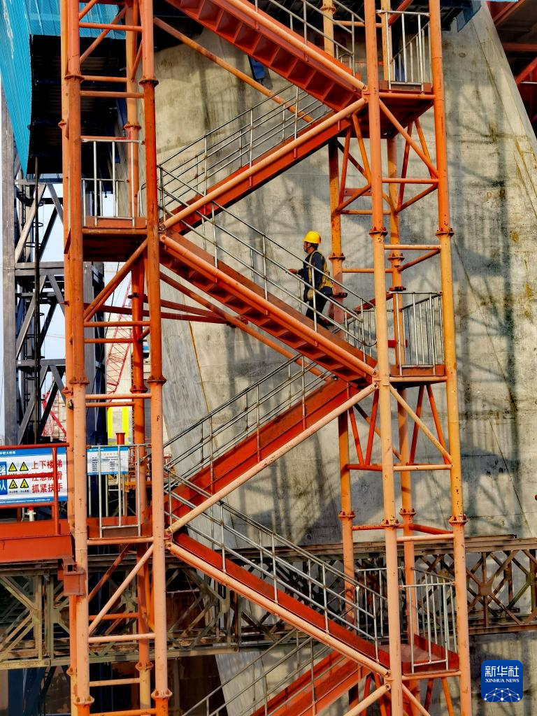 11月9日,工人前往崇启公铁长江大桥4号主塔下横梁及其塔柱连接段首层浇筑现场作业。
