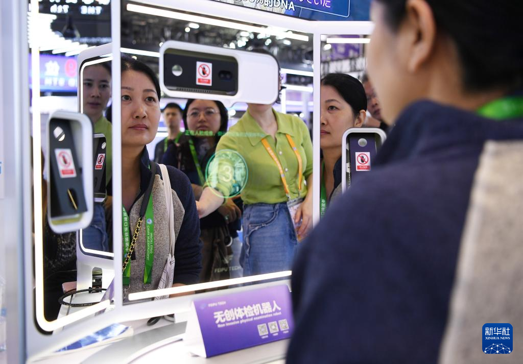 11月9日,在第七届进博会创新孵化专区,参观者体验飞瀑智能的无创体检机器人。