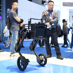 11月9日,在第七届进博会创新孵化专区,可立点科技的工作人员在展示瘫痪助行移动机器人。