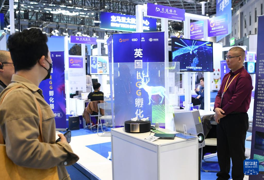11月9日,在第七届进博会创新孵化专区,参观者查看光子晶体科技的光子芯片透明屏。