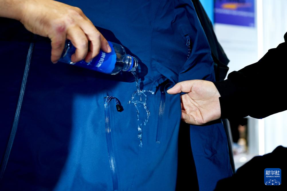 11月9日,在第七届进博会创新孵化专区,一个户外服装品牌的工作人员展示服装的防水性能。