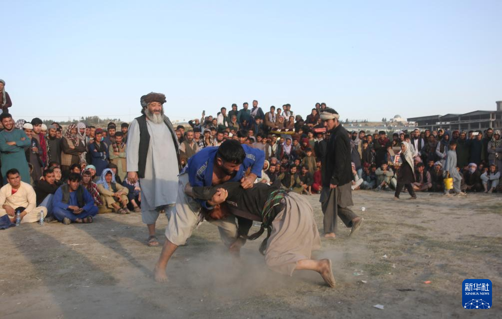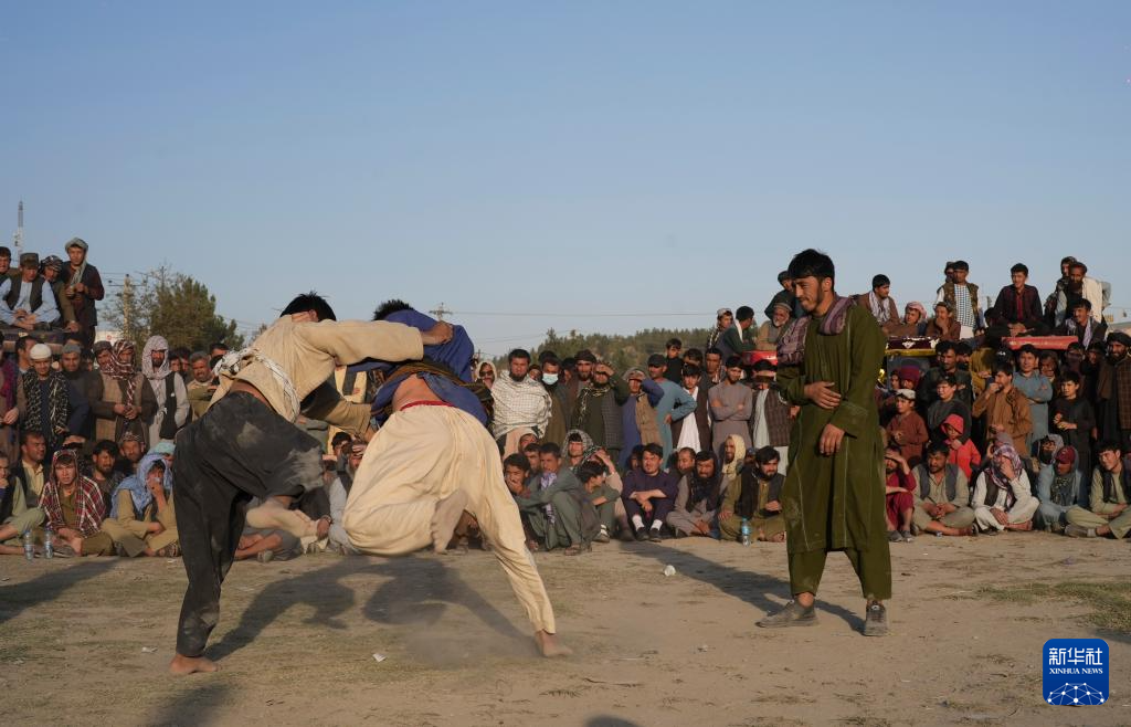 每逢周五下午,在阿富汗首都喀布尔市的一处公园内,都会聚集一批摔跤爱好者进行传统摔跤比赛,吸引许多居民前来观看。阿富汗的传统摔跤比赛是当地民众喜爱的一项运动,有较强的对抗性和观赏性。