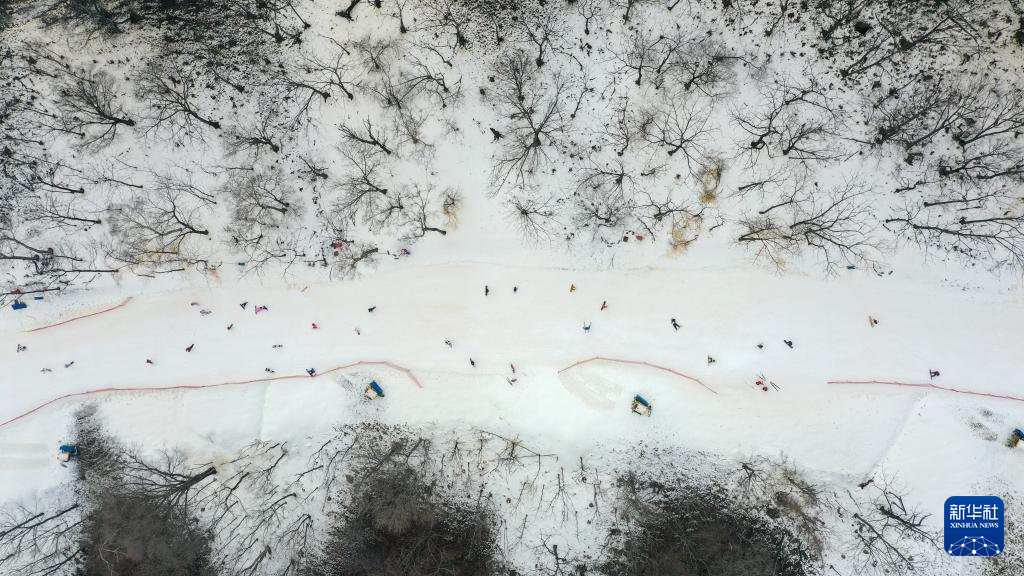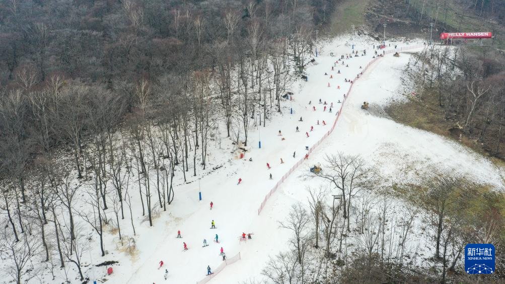 11月9日,滑雪爱好者在北大湖滑雪度假区滑雪(无人机照片)。