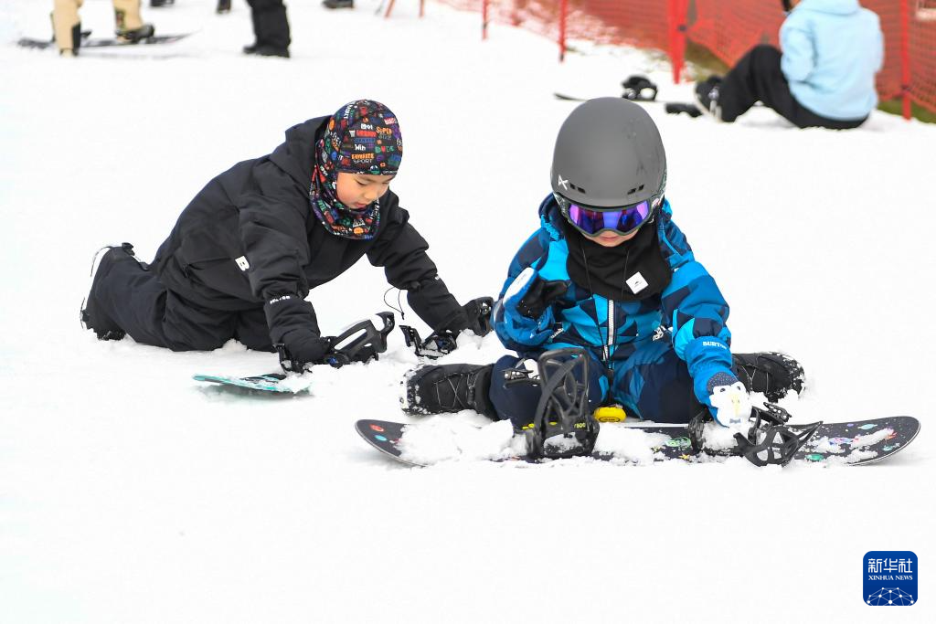 11月9日,在北大湖滑雪度假区,两名小朋友在雪地上玩耍。