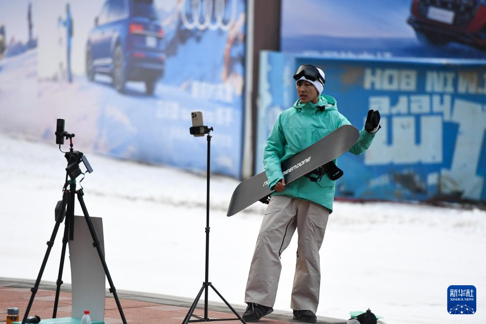 11月9日,在北大湖滑雪度假区,销售人员进行线上雪具销售直播。