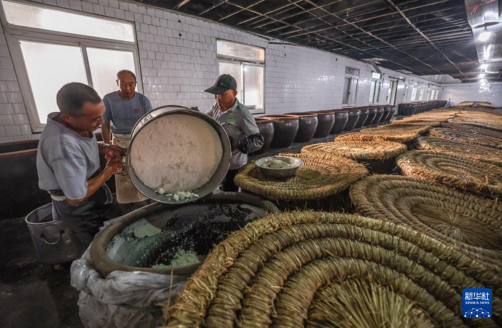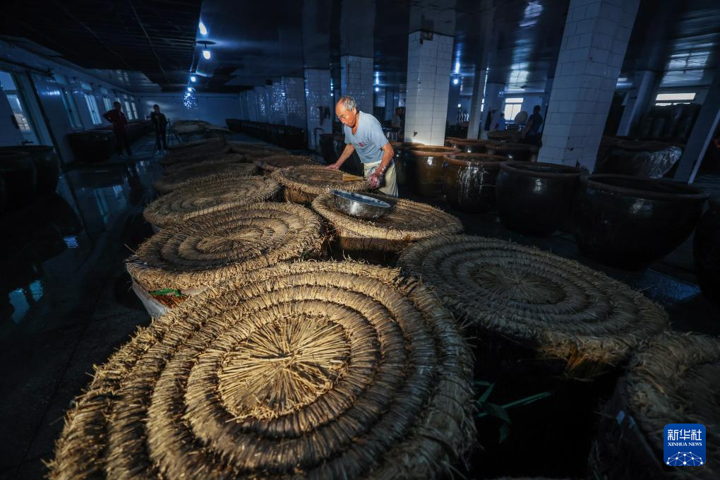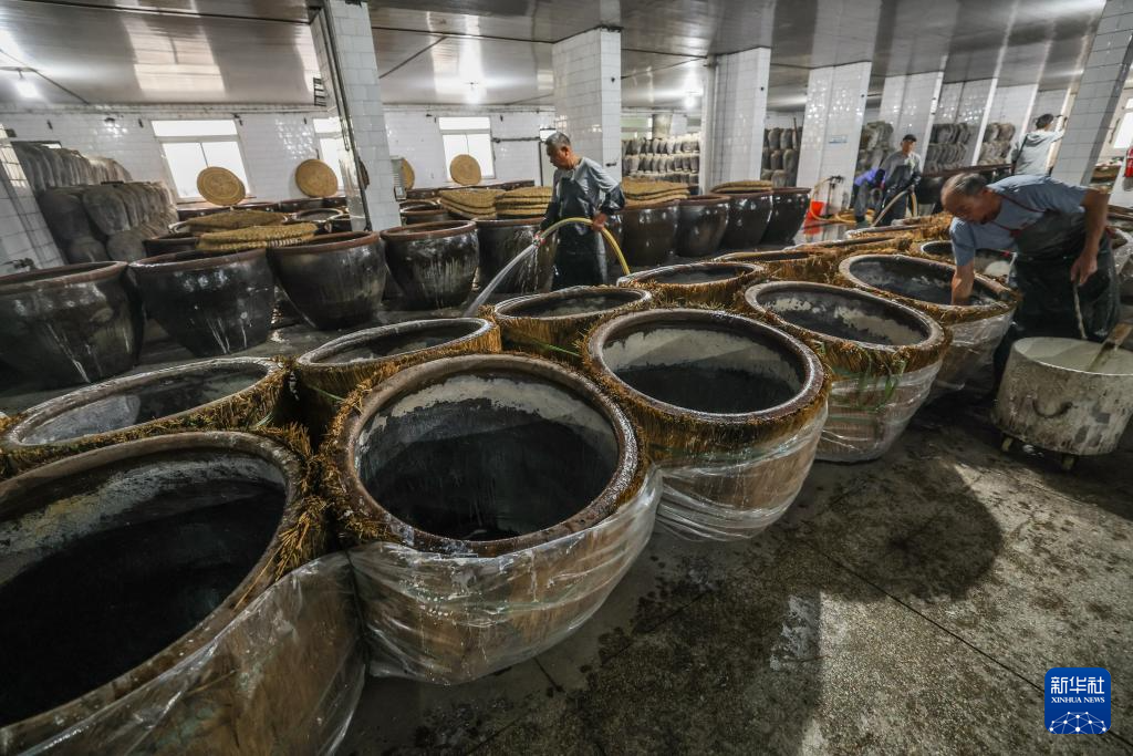 11月9日,在嘉兴市海盐沈荡酿造有限公司的酿酒车间内,酿酒师傅给装有糯米的酒缸落缸加药,加入酒曲发酵。