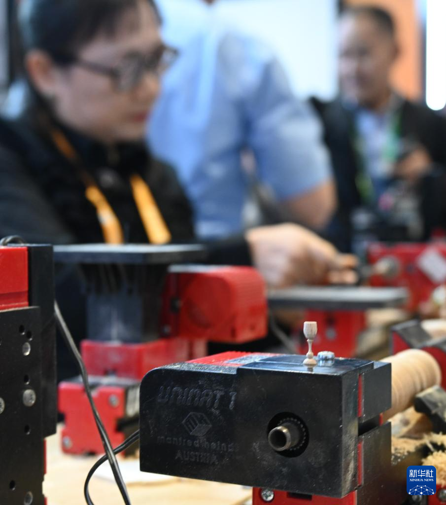 11月8日,在第七届进博会上,一名参展商用精密加工设备加工口径2毫米的木制“水杯”。