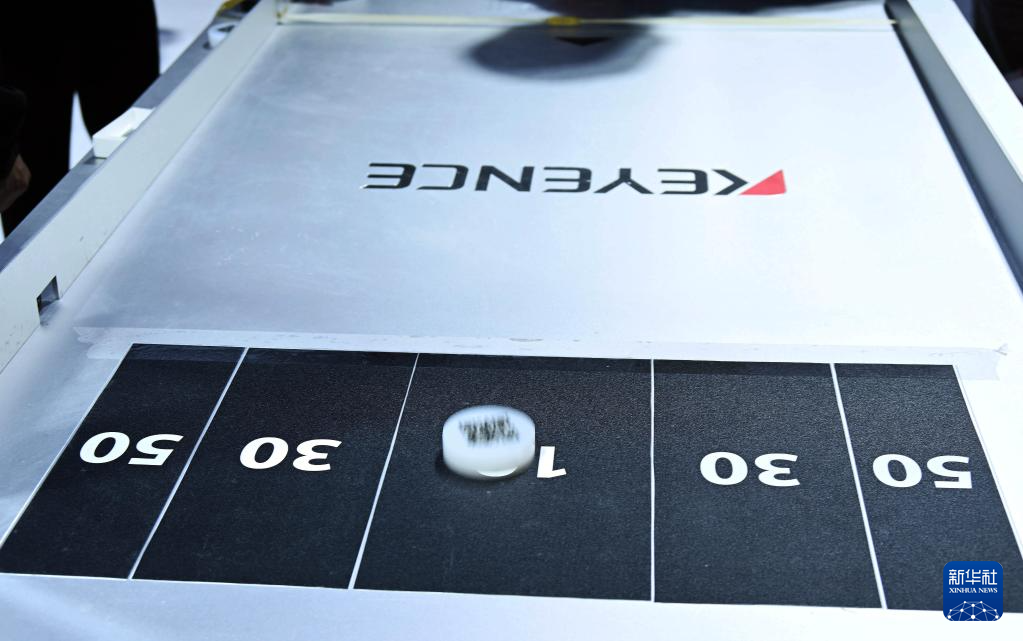 11月8日,在第七届进博会上,印有二维码的圆塑料片快速通过二维码检测仪。