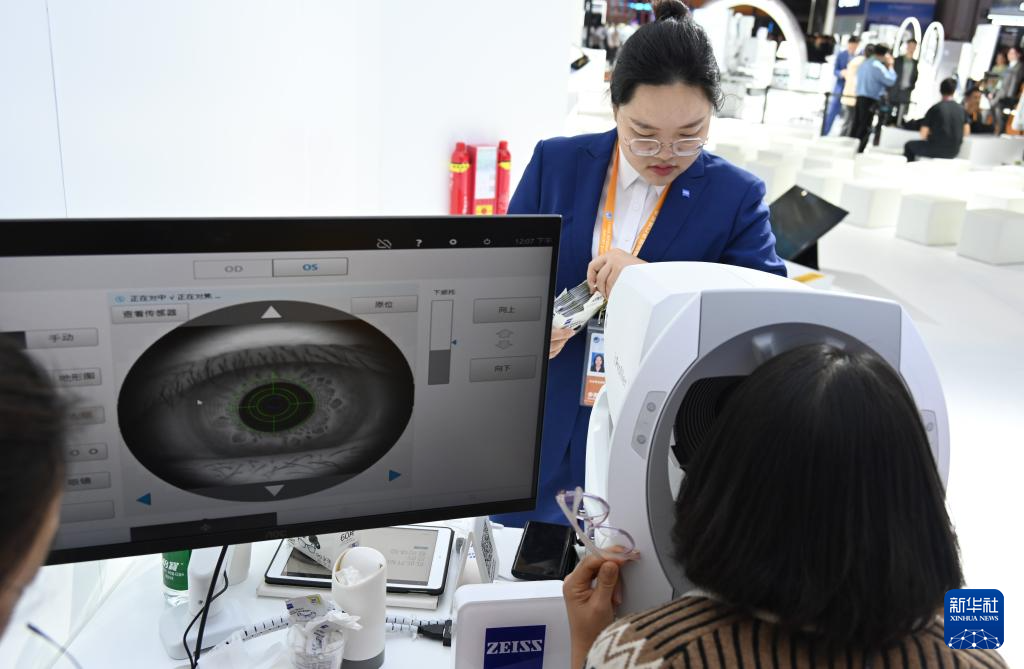 11月8日,在第七届进博会上,参观者在体验一款眼科测试仪。
