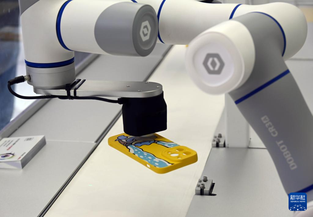 11月8日,在第七届进博会上,一款机械臂在移动手机壳。
