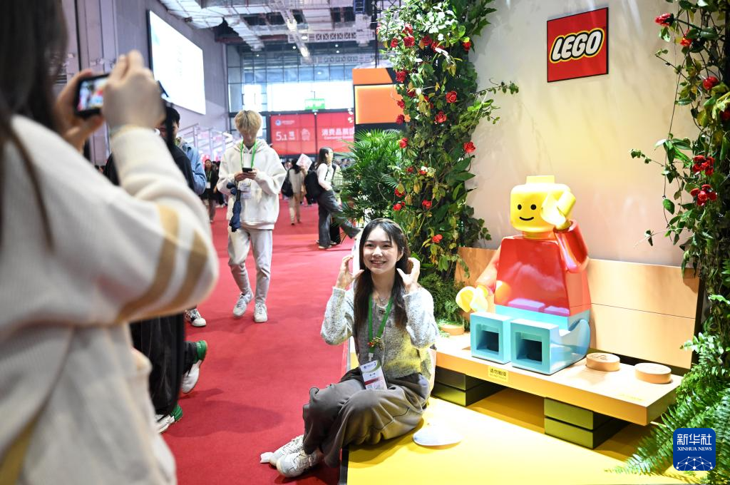 11月9日,观众在第七届进博会乐高展台外打卡拍照。乐高是进博会七届“全勤生”。