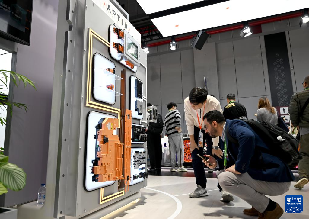 11月8日,观众在第七届进博会安波福展台了解汽车电气化解决方案。安波福今年首次参展进博会。