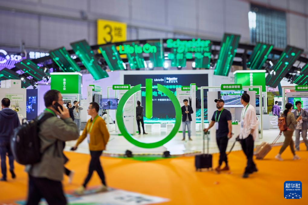 11月9日,观众走过第七届进博会施耐德电气展台。施耐德电气是进博会七届“全勤生”。